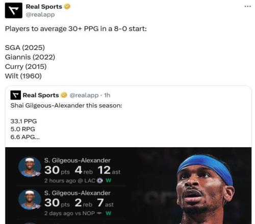 这也是开季至今亚历山大傲人表现的缩影,新赛季至今亚历山大场均交出33.1分5板6.6助1断1.4帽,成为张伯伦(60-61)、库里(15-16)和字母哥(22-23)后第四位率队开季拿下8连胜同时场均交出30+得分表现的球员。